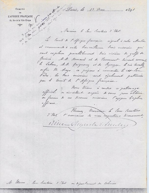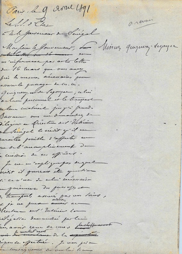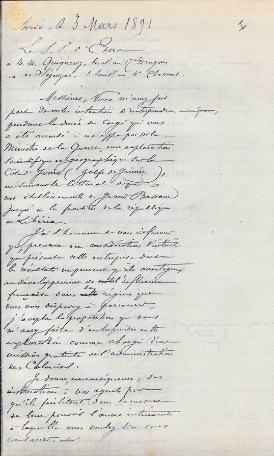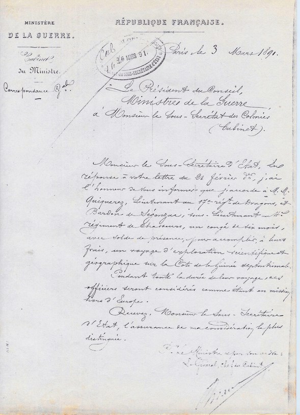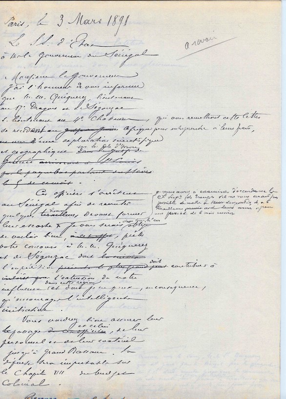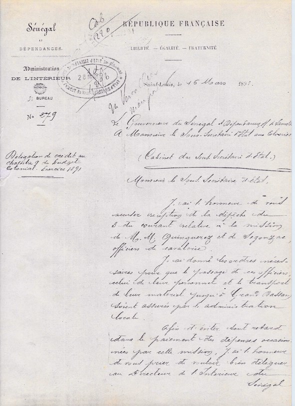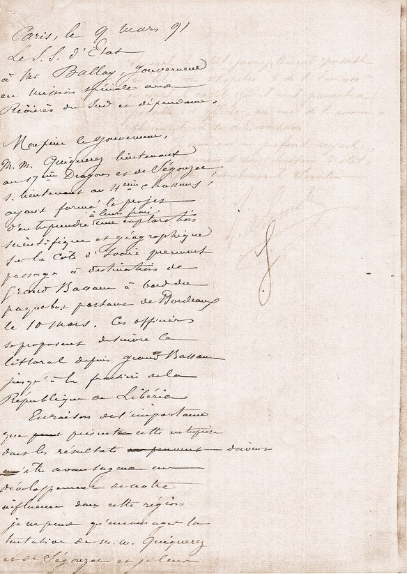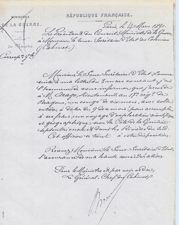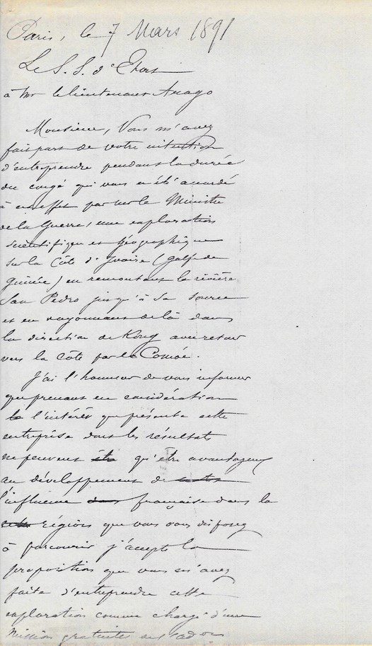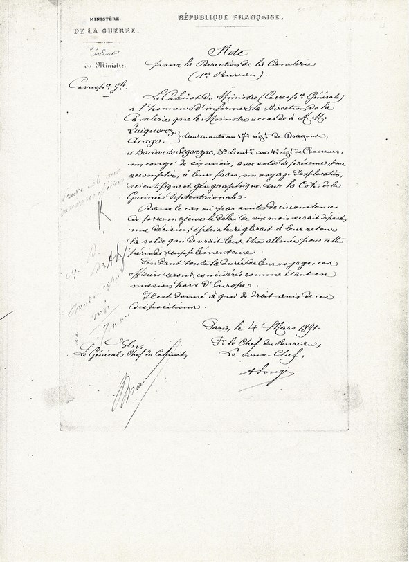 Le Sous-Secrétaire d'Etat à Mr le Lieutenant ARAGO